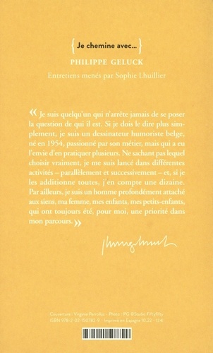 "Je suis quelqu'un qui n'arrête jamais de se poser la question de qui il est. Si je dois le dire plus simplement, je suis un dessinateur humoriste belge, né en 1954, passionné par son métier, mais qui a eu l'envie d'en pratiquer plusieurs. Ne sachant pas lequel choisir vraiment, je me suis lancé dans différentes activités - parallèlement et successivement - et, si je les additionne toutes, j'en compte une dizaine. Par ailleurs, je suis un homme profondément attaché aux siens, ma femme, mes enfants, mes petits-enfants, qui ont toujours été, pour moi, une priorité dans mon parcours". P. G. Philippe Geluck entre dans l'existence sous une bonne étoile : Geluck signifie "chance" en flamand. Au fil des ans, il arpente des vallées verdoyantes avec succès et brio : théâtre, télévision, radio, dessin, BD, sculpture... Le 22 mars 1983, il naît une seconde fois. Couché sur une page du Soir, son Chat débonnaire sort de l'imprimerie et ses strips à trois cases s'imposent en Belgique, en France et au-delà. Il déambule chez les libraires, dans les journaux, chez nous (aux murs des toilettes ou de la cuisine), dans les galeries, aux Beaux-Arts et jusqu'aux Champs-Elysées ! Avec les yeux du Chat, Geluck observe le monde : il s'émeut de ses misères, se fout de ses incohérences, s'indigne de ses bêtises. Et la chute est certaine : morts de rire ! Entretien mené par Sophie Lhuillier