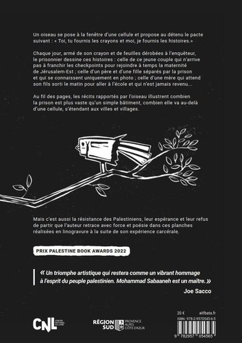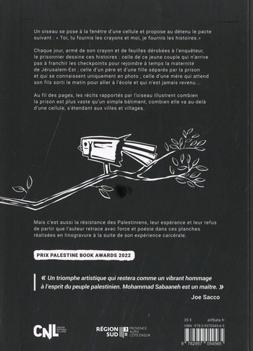 Le récit commence en prison. Un oiseau se pose à la fenêtre d'une cellule et propose au détenu le pacte suivant : "Toi, tu fournis les crayons et moi, je fournis les histoires". Chaque jour, armé de feuilles dérobées à l'enquêteur et de son crayon, le prisonnier dessine ces histoires : celle de ce jeune couple qui n'arrive pas à franchir les checkpoints pour rejoindre à temps la maternité de Jérusalem , celle d'un père et d'une fille séparés par la prison et qui se connaissent uniquement en photo , ou encore celle d'une mère qui attend son fils sorti le matin pour aller à l'école et qui n'est jamais revenu... Au fil des pages, les récits rapportés par l'oiseau illustrent combien la prison est plus vaste qu'un simple bâtiment, combien elle va au-delà d'une cellule, s'étendant aux villes et villages... Mais c'est aussi la résistance des Palestiniens, leur espérance, leur confiance et leur refus de partir que l'auteur retrace dans ces planches en noir et blanc réalisées en linogravure.