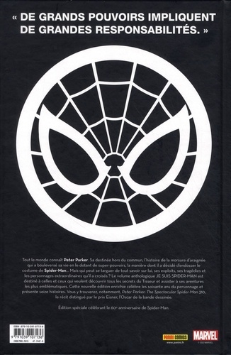 Tout le monde connaît Peter Parker. Sa destinée hors du commun, l'histoire de la morsure d'araignée qui a bouleversé sa vie en le dotant de super-pouvoirs, la manière dont il a décidé d'endosser le costume de Spider-Man... Mais qui peut se targuer de tout savoir sur lui, ses exploita. ses tragédies et les personnages extraordinaires qu'il a croisés ? Le volume anthologique JE SUIS SPIDER-MAN est destiné! celles et ceux qui veulent découvrir tous les secrets du Tisseur et assister à ses aventures les plus emblématiques. Cette nouvelle édition enrichie célèbre les soixante ans du personnage et présente seize histoires. Vous y trouverez notamment, Peter Parker : The Spectacular Spider-Man 310, le récit distingué parle prix Eisner, l'Oscar de la bande dessinée.
