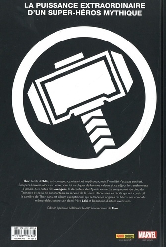 La puissance extraordinaire d'un super-héros mythique. Thor, le fils d'Odin, est courageux. puissant et impétueux, mais l'humilité n'est pas son fort. Son père l'envoie alors sur Terre pour lui inculquer de bonnes valeurs et ce séjour le transformera à jamais. Aux côtés des Avengers, le détenteur de Mjolnir va mettre son pouvoir de dieu du Tonnerre et celui de son marteau au service de la Terre. Découvrez les récits qui ont construit la carrière de Thor dans cet album exceptionnel qui retrace les origines du héros. ses combats mémorables contre son demi-frère Loki et beaucoup d'autres aventures. Edition spéciale célébrant le 6oe anniversaire de Thor.