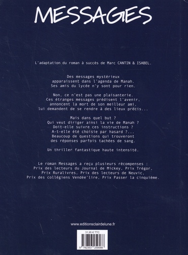 L'adaptation du roman à succès de Marc CANTIN & ISABEL. Des messages mystérieux apparaissent dans l'agenda de Manah. Ses amis du lycée n'y sont pour rien. Non, ce n'est pas une plaisanterie. Ces étranges messages prédisent l'avenir, annoncent la mort de son meilleur ami, lui demandent de se rendre à des lieux précis... Mais dans quel but ? Qui veut diriger ainsi la vie de Manah ? Doit-elle suivre ces instructions ? A-t-elle été choisie par hasard ? ... Beaucoup de questions qui trouveront des réponses parfois tachées de sang. Un thriller fantastique haute intensité. Le roman Messages a reçu plusieurs récompenses : Prix des lecteurs du Journal de Mickey, Prix Trégor, Prix Ruralivres, Prix des lecteurs de Neuvic, Prix des collégiens Vendée'lire, Prix Passer la cinquième.