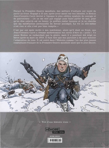 Durant la Première Guerre mondiale, des milliers d'enfants ont tenté de partir au front. Engagé à 15 ans, après avoir menti sur son identité, le Breton Jean-Corentin Carré devint à l'époque le plus célèbre symbole de courage et de patriotisme : "Je ne me suis pas engagé pour faire parler de moi, pour qu'on dise celui-là est un brave ; je préfère rester inconnu et je ne cherche que ma satisfaction personnelle du devoir accompli. La vie en elle-même n'est rien si elle n'est pas bien remplie." C'est par ces mots écrits à son instituteur, alors qu'il était au front, que Jean-Corentin Carré a résumé modestement son envie d'être un "poilu". Ce jeune Breton ne recherchait pas la gloire, mais il a pourtant été érigé en héros après sa mort en 1918. Il faut dire que son parcours a de quoi susciter l'admiration de tous. Il est entré dans l'Histoire comme l'un des plus jeunes combattants français de la Première Guerre mondiale ainsi que le plus décoré.