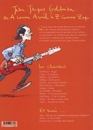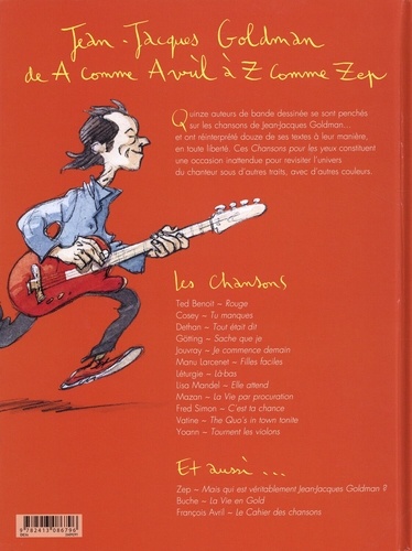 Jean-Jacques Goldman de A comme Avril à Z comme Zep. Quinze auteurs de bande dessinée se sont penchés sur les chansons de Jean-Jacques Goldman... et ont réinterprété douze de ses textes à leur manière, en toute liberté. Ces Chansons pour les yeux constituent une occasion inattendue pour revisiter l'univers du chanteur sous d'autres traits, avec d'autres couleurs. Les chansons : Ted Enflait - Rouge ; Cosey - Tu manques ; Dethan - Tout était dit ; Götting - Sache que le ; Jouvray - Je commence demain ; Manu Larcenet - Filles faciles ; Léturgie - Là-bas ; Lisa Mandel - Elle attend ; Mazan - La Vie par procuration ; Fred Simon - C'est ta chance ; Vatine - The Quo's in town tonite ; Yoann - Tournent les violons. Et aussi... Zep - Mais qui est véritablement Jean-Jacques Goldman ? Buche - La Vie en Gold ; François Avril - Le Cahier des chansons.