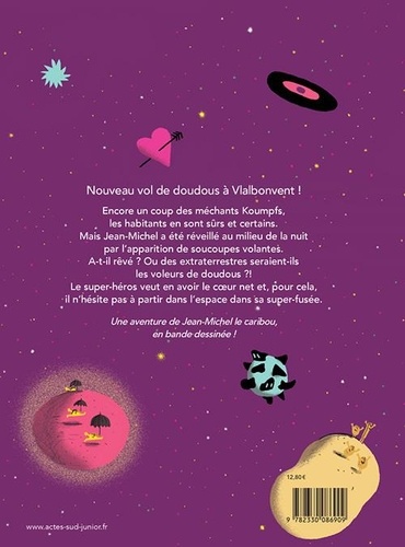 Nouveau vol de doudous à Vlalbonvent ! Encore un coup des méchants Koumpfs, les habitants en sont sûrs et certains. Mais Jean-Michel a été réveillé au milieu de la nuit par l'apparition de soucoupes volantes. A-t-il rêvé ? Ou des extraterrestres seraient-ils les voleurs de doudous ?! Le super-héros veut en avoir le coeur net et, pour cela, il n'hésite pas à partir dans l'espace dans sa super-fusée.