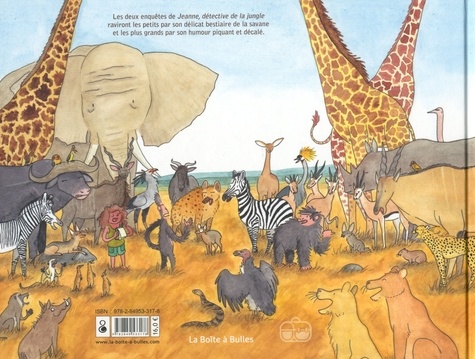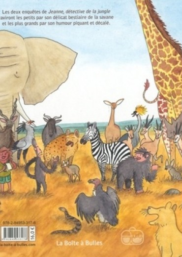 Le pique-boeuf Marcel-Emililen a disparu ! Et ça n'est pas dans ses habitudes. Six jours que sa femme Sylvie-Eglantine et ses enfants s'inquiètent de son absence. Heureusement, Jeanne, détective de la jungle, n'a pas son pareil pour résoudre des telles conquêtes. Accompagnée de ses fidèles acolytes, les singes Léon-Casimir et François-Xavier, la voilà partie au coeur de la jungle à la recherche du malheureux disparu. L'enquête les mènera sur les traces de trois suspects potentiels, Lucien-Jérémie, l'éléphant à la défense brisée, Damien-Jean le buffle mal luné et Gaspard-Luc, le rhino bigleux. A peine rentrée chez elle, Jeanne se retrouve aux prises avec un nouveau mystère auquel sont mêlés cette fois un ratel amateur de miel et des serpents gloutons.