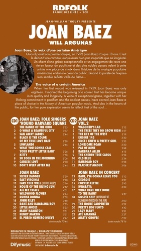 Joan Baez, La voix d'une certaine Amérique Quand paraît son premier disque, en 1959, Joan Baez n'a que 18 ans. C'est le début d'une carrière unique aussi bien par sa qualité que sa longévité. Un chant d'une grâce exceptionnelle et un engagement de toute une vie en faveur du pacifisme et des plus nobles causes valent à cette artiste une place de choix dans l'histoire de la musique populaire américaine et dans le coeur du public. Quand la pureté de l'expression Semble refléter celle de l'âme...