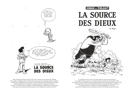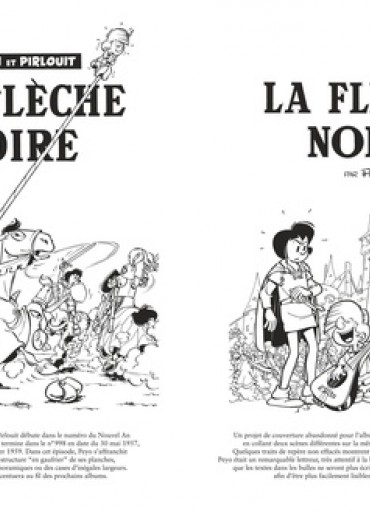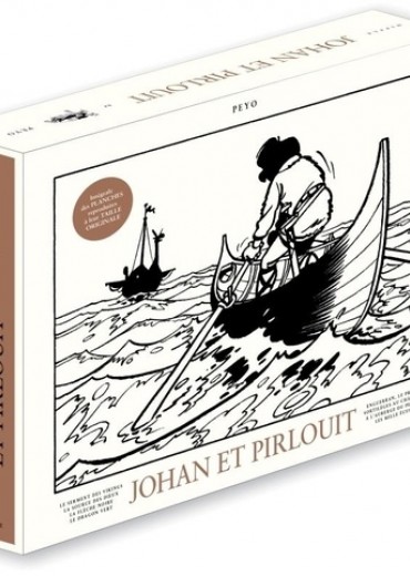 Ce deuxième coffret d'art de "La Grande bibliothèque" consacré à "Johan et Pirlouit" comporte tous les récits imaginés et dessinés par l'auteur entre 1955 et 1957, soit 3 albums complets et 6 histoires courtes publiées dans Risque-Tout et le journal Spirou. Lorsque Dupuis lance en 1955 un nouvel hebdomadaire à destination des jeunes, les auteurs de Spirou sont appelés à la barre. C'est ainsi que Peyo dessinera 4 histoires courtes mettant en scène Johan et Pirlouit pour Risque-Tout : Le Dragon vert, Enguerran le Preux, Sortilèges au château, A l'auberge du pendu. Il ne met pas pour autant de côté des récits plus longs, et les lecteurs de Spirou ont la joie de retrouver les deux héros dans deux grands récits : Le Serment des Vikings puis La Source des dieux. Immédiatement après la publication de ce dernier, Peyo réalise de nouveau une historiette pour un spécial Noël : Veillée de Noël. Il continue avec un tome complet, La Flèche noire, et début 1957 par un récit de 2 planches pour le numéro 1000 du Journal : Les Mille Ecus ! Cet ouvrage comporte 330 pages à l'italienne en format géant sur beau papier mat. Les planches sont présentées comme lorsque Peyo les travaillait à l'époque.