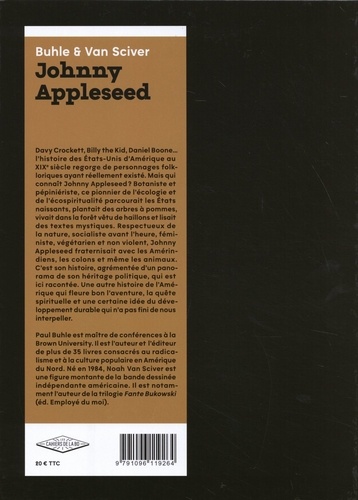 L'Américain John Chapman, alias Johnny Appleseed, est un pionnier de l'agriculture biologique contemporaine. Il s'est fait connaître en semant des graines de pommiers du Wisconsin à l'Indiana. Plus tard, celle-ci donneront naissance à l'industrie du cidre brut. Johnny Appleseed planta également les germes de la non-violence et du végétarisme, prônant la paix entre les Amérindiens et les colons et véhiculant la philosophie humaniste du théologien suédois Emanuel Swedenborg. Sa vie, extraordinaire, est ici adaptée en bande dessinée. Paul Buhle est maître de conférences à la Brown University. Il est l'auteur et l'éditeur de plus de 35 livres consacrés au radicalisme et à la culture populaire en Amérique du Nord. Né en 1984, Noah Van Sciver est une figure montante de la bande dessinée indépendante américaine. Il est l'auteur d'une série de trois volumes très remarquée : Fante Bukowski (éd. Employé du Moi).