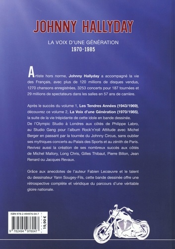Artiste hors norme, Johnny Hallyday a accompagné la vie des Français, avec plus de 120 millions de disques vendus, 1270 chansons enregistrées, 3253 concerts pour 187 tournées et 29 millions de spectateurs dans les salles en 57 ans de carrière. Après le succès du volume 1, Les Tendres Années (1943/1969), découvrez ce volume 2, La Voix d'une Génération (1970/1985), la suite de la vie trépidante de cette idole en bande dessinée. De l'Olympic Studio à Londres aux côtés de Philippe Labro, au Studio Gang pour l'album Rock'n'roll Attitude avec Michel Berger en passant par la tournée du Johnny Circus, sans oublier ses mythiques concerts au Palais des Sports et au zénith de Paris. Revivez aussi la création de ses nombreux succès aux côtés de Michel Mallory, Long Chris, Gilles Thibaut, Pierre Billon, Jean Renard ou Jacques Revaux. Grâce aux anecdotes de l'auteur Fabien Lecoeuvre et le talent du dessinateur Yann Sougey-Fils, cette bande dessinée offre une rétrospective complète et véridique du parcours d'une véritable gloire nationale.