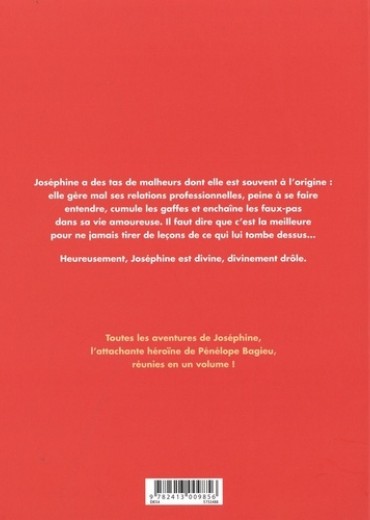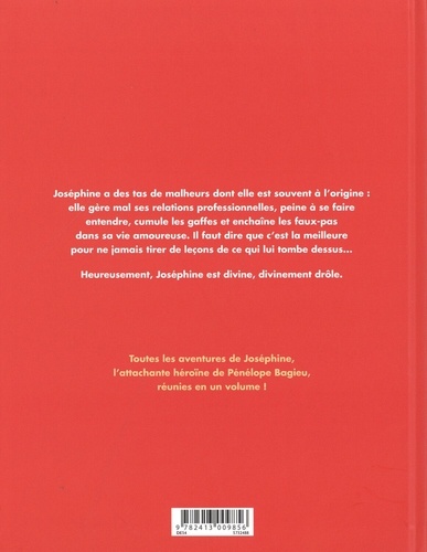 Joséphine a des tas de malheurs dont elle est souvent à l'origine : elle gère mal ses relations professionnelles, peine à se faire entendre, cumule les gaffes et enchaîne les faux-pas dans sa vie amoureuse. Il faut dire que c'est la meilleure pour ne jamais tirer de leçons de ce qui lui tombe dessus... Heureusement, Joséphine est divine, divinement drôle. Toutes les aventures de Joséphine, l'attachante héroïne de Pénélope Bagieu, réunies en un volume !