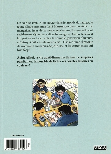 Un soir de 1956. Alors novice dans le monde du manga, le jeune Chiba rencontre Leiji Matsumoto dans un atelier de mangakas. Issus de la même génération, ils sympathisent rapidement. Quant au "dieu du manga", Osamu Tezuka, il fait part de ses tourments à la nouvelle génération d'auteurs, et Tetsuya Chiba en a le coeur serré... Dans ce tome, il raconte de nouveaux souvenirs de jeunesse et les expériences qui l'ont forgé. Aujourd'hui, la vie quotidienne recèle tant de surprises palpitantes. Impossible de lâcher ces courtes histoires en couleurs !
