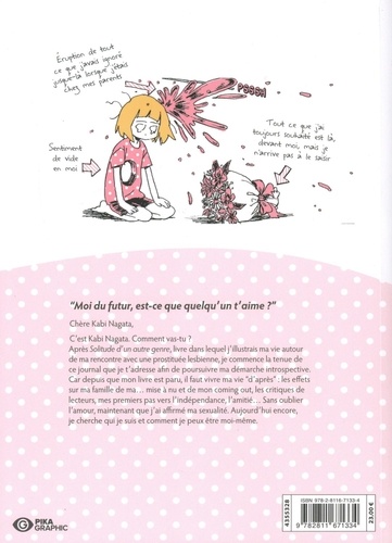 Chère Kabi Nagata, C'est Kabi Nagata. Comment vas-tu ? Après Solitude d'un autre genre, livre dans lequel j'illustrais ma vie autour de ma rencontre avec une prostituée lesbienne, je commence la tenue de ce journal que je t'adresse afin de poursuivre ma démarche introspective. Car depuis que mon livre est paru, il faut vivre ma vie "d'après" : les effets sur ma famille de ma... mise à nu et de mon coming out, les critiques de lecteurs, mes premiers pas vers l'indépendance, l'amitié... Sans oublier l'amour, maintenant que j'ai affirmé ma sexualité. Aujourd'hui encore, je cherche qui je suis et comment je peux être moi-même.