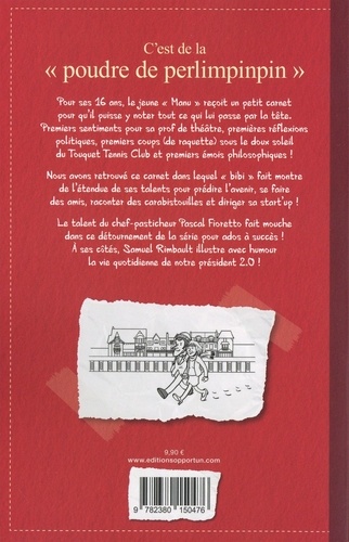 four ses 16 ans, le jeune "Manu" reçoit un petit carnet pour qu'il puisse y noter tout ce qui lui passe par la tête. Premiers sentiments pour sa prof de théâtre, premières réflexions politiques, premiers coups (de raquette) sous le doux soleil du Touquet Tennis Club et premiers émois philosophiques ! Nous avons retrouvé ce carnet dans lequel "bibi" fait montre de l'étendue de ses talents pour prédire l'avenir, se Faire des amis, raconter des carabistouilles et diriger sa start'up ! Le talent du chef-pasticheur Pascal Fioretto fait mouche dans ce détournement de la série pour ados à succès ! A ses côtés, Samuel Rimbault illustre avec humour la vie quotidienne de notre président 2.0 !
