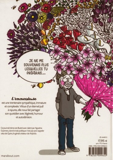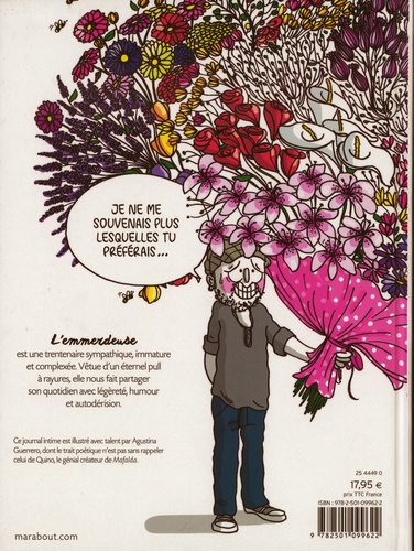 L'emmerdeuse est une trentenaire sympathique, immature et complexée. Vêtue d'un éternel pull à rayures, elle nous fait partager son quotidien avec légèreté, humour et autodérision. Ce journal intime est illustré avec talent par Agustina Guerrero, dont le trait poétique n'est pas sans rappeler celui de Quino, le génial créateur de "Mafalda".