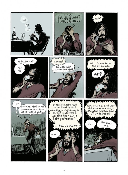 Naast de emoties, de kleuren en de telefoongesprekken zit er ook een ontbolstering in de paginaopbouw. In het begin kom je nauwelijks los van een klassieke structuur. Het is bijna een rigide wafelijzerstructuur. Op het eind speel je volop met kadrering. Je gaat zelfs van paginabrede kaders naar kaderloze pagina’s. Iemand om mee te praten is een Bolero, de complete ontploffing.