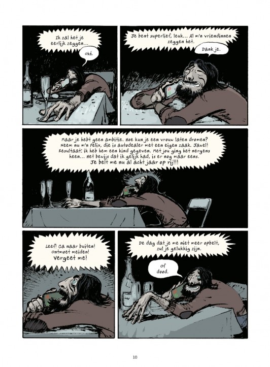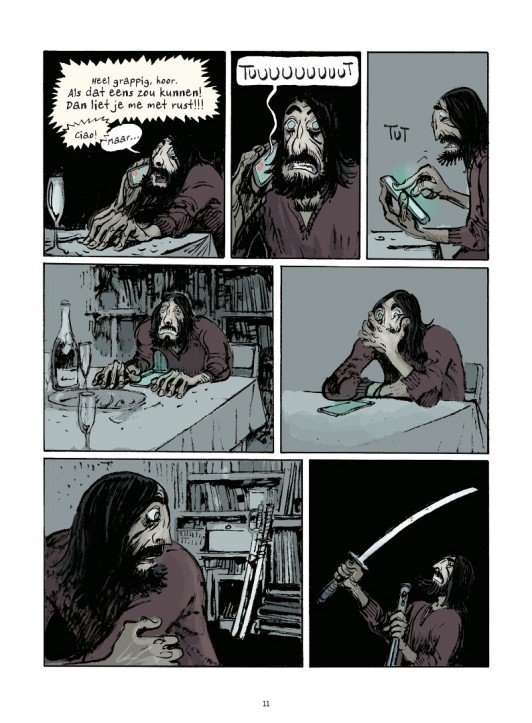 PANACCIONE: “Ik heb er van alles mee gedaan! Het boek telt meer dan 300 pagina’s met tal van extra scènes die ik niet gebruikt heb. Zo gaat Massarotto uitgebreid in op Samuel Verdi’s desastreuze liefdesleven. Ook vele huiselijke - en kantoorscènes heb ik geschrapt. In het boek zijn die nodig, maar voor de strip heb ik me geconcentreerd op het beresterke kernverhaal. Je zit in de strip ook sneller in het hoofd van het personage. Ik laat hem praten vanuit de ik-figuur. (denkt na) Ik heb echt wel veel geschrapt. Daar zitten zelfs hele dialogen tussen waar Samuel telefoneert met zijn tienjarige zelf. Aan de andere kant heb ik ook zaken toegevoegd. Ik laat de oudere Samuel zijn eigen verleden vertellen. Zo kon ik dit gemakkelijker grafisch verwerken. Ik koos ook vaak voor woordeloze scènes die hele beschrijvingen vervangen. Als je pakweg Samuels kantoor binnenstapt, heb je al een idee wie hij eigenlijk is. Een beeld kan al heel veel suggereren.”