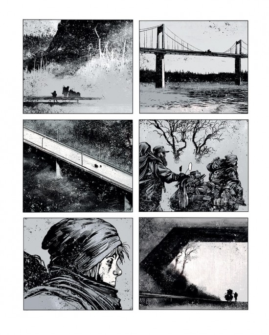 Nee, natuurlijk niet, want De Weg bestaat eigenlijk uit een levenloos universum, apocalyptische landschappen, kapotgeslagen, vuil, smerig, vol dode lichamen. Een omgeving zonder natuur, zonder bladeren, zonder dieren. Ik was bang dat ik het tekenen niet lang zou kunnen volhouden, verstikt zou worden door de kilte. Maar het was de alomtegenwoordige as die alles veranderde, het decor aankleedde, het kleurde, het transformeerde. Ik moest ook de uitdaging aangaan om een boek met weinig actie en dialoog om te zetten in beelden. Als Cormac McCarthy een landschap beschrijft op een kwart bladzijde, had ik soms drie of vier pagina’s nodig om hetzelfde gevoel over te brengen. Het is een boek vol stiltes. En de tekeningen moeten interessant genoeg zijn om de lezer aan het lezen te houden zonder dat er per se woorden bij hoeven.