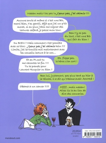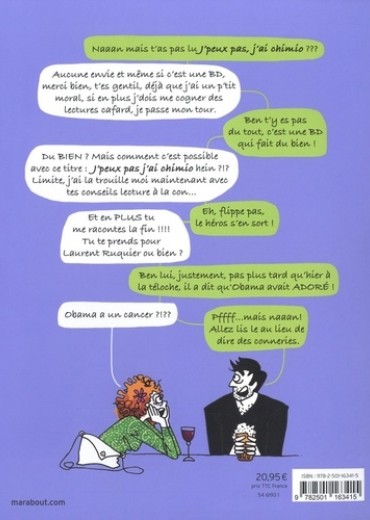 Accompagnée de sa meilleure amie, son mari, elle va devoir affronter ses propres peurs et faire face aux réactions diverses et variées de l'entourage. Cet album est résolument positif. Il donne des clés de compréhension au malade et à ses proches, sur le ton de l'humour avec une grande dose de bienveillance. " Cette femme va vivre son parcours de la combattante, les étapes, les embûches, évoquer le travail du personnel soignant, les longues heures d'attente, la solitude, la peur... L'héroïne veut mettre toutes les chances de son côté pour s'en sortir, elle testera tout ce qui est possible. C'est aussi une histoire qui finit bien, celle d'un cancer qui est éradiqué. J'peux pas j'ai chimio, rationalise ce qu'est le cancer grâce à l'expérience unique de nos auteures, Camille et Alexandra. Elles souhaitent faire passer un message optimiste et décalé pour aider les patients et leurs proches à garder moral et sérénité qui sont les meilleures armes pour une lutte efficace contre cet ennemi ! Cet album devrait être remboursé par la sécurité sociale !