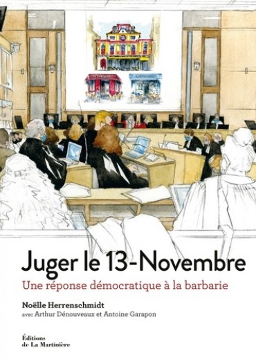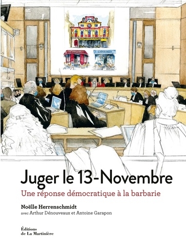 Historique, hors normes, bouleversant, tels sont les qualificatifs entendus pendant ce procès sans équivalent des attentats ayant touché la France le 13 novembre 2015. Dix mois de procès, 2 234 parties civiles, 350 avocats... L'aquarelliste-reporter Noëlle Herrenschmidt est bien connue pour avoir déjà couvert les procès Barbie, Touvier ou Papon, trois procès pour crimes contre l'humanité qui l'ont convaincue de l'impératif absolu de transmettre par le dessin la parole des victimes. Elle ne pouvait manquer de suivre un événement d'une telle ampleur. Le 8 septembre 2021, vêtue de son indispensable gilet de travail, accompagnée de ses carnets de dessins et de sa fidèle boîte d'aquarelles, elle retrouve le palais de justice de Paris et sa salle des pas perdus pour s'immerger une dernière fois, avec la même passion, dans le dessin d'audience. C'est son journal illustré qu'elle nous livre ici, avec les paroles des victimes, avocats, magistrats, greffiers, rencontrés tout au long de ce procès-fleuve, achevé le 29 juin 2022. Elle est accompagnée de son complice de toujours, le magistrat Antoine Garapon, et d'Arthur Dénouveaux, rescapé du Bataclan et président de l'association Life for Paris.