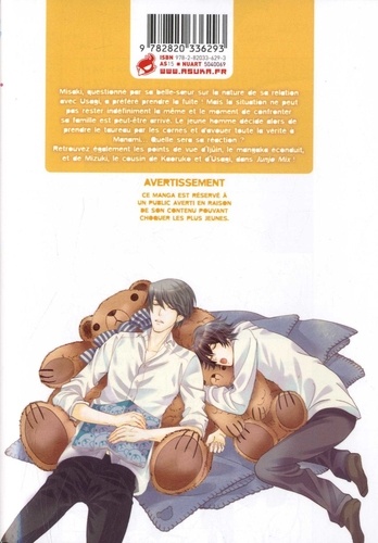 Misaki, questionné par sa belle-soeur sur la nature de sa relation avec Usagi, a préféré prendre la fuite ! Mais la situation ne peut pas rester indéfiniment la même et le moment de confronter sa famille est peut-être arrivé. Le jeune homme décide alors de prendre le taureau par les cornes et d'avouer toute la vérité à Manami... Quelle sera sa réaction ? Retrouvez également les points de vue d'Ijûin, le mangaka éconduit, et de Mizuki, le cousin de Kaoruke et d'Usagi, dans Junje Mix !