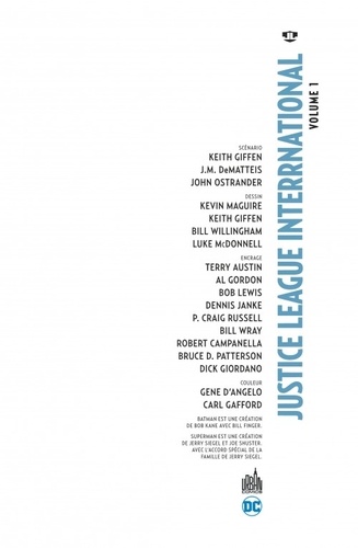 VOLUME 1 : Après avoir subi la Crise des Terres infinies et l'invasion de Darkseid, c'est un nouveau jour qui se lève pour les super-héros, et une nouvelle Ligue de Justice qui se forme, â dimension mondiale. Mais celle-ci, financée par le mystérieux magnat Maxwell Lord, est autant menacée par des dissensions internes que par les nombreux adversaires qu'elle rencontre. JUSTICE LEAGUE INTERNATIONAL présente pour la première fois en version française la série culte et délurée du plus grand groupe de l'Univers DC. Servie par les situations loufoques et les dialogues percutants du tandem Keith GIFFEN (FUTURES END) et J.M. DEMATTEIS (ADVENTURES OF SUPERMAN), et le trait habile et expressif de Kevin MAGUIRE (WORLDS FINEST), cette période demeure l'une des plus inventives et attachantes qu'ait connue le groupe.