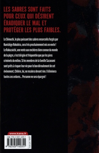 Le Shinuchi, le plus puissant des sabres ensorcelés forgés par Kunishige Rokuhira, sera très prochainement mis en vente ! Le Rakuzaichi, une vente aux enchères bien connue du monde de la pègre, n'est dirigée et fréquentée que parles pires criminels du milieu. Si les membres de la famille Sazanami sont prêts à risquer leur vie pour le bon déroulement de cet événement, Chihiro, lui, ne reculera devant rien. Il éliminera toutes ces ordures... Personne ne sera épargné!