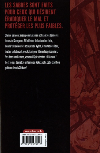 Chihiro parvient à récupérer Enten en utilisant les dernières forces de Kuregumo. A l'intérieur de la chambre forte, il endure les violentes attaques de Kyôra, le maître des lieux, tout en collaborant avec Hakuri pour libérer les prisonniers. Pris dans un dilemme, vers quoi Kyôra tendra-t-il la main ? Il est temps de mettre un terme au Rakuzaichi, cette tradition qui dure depuis 200 ans !