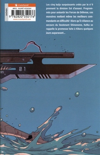 Les cinq kaiju surpuissants créés par le n°9 prennent la division Est d'assaut. Programmés pour anéantir les Forces de Défense, ces monstres mettent même les meilleurs commandants en difficulté ! Alors qu'il s'élance au secours du lieutenant Shinonome, Kafka se rappelle la promesse faite à Kikoru quelques jours auparavant...