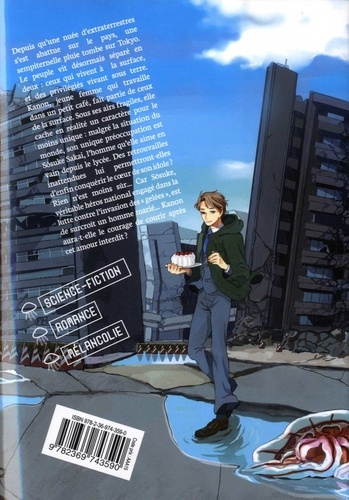 Série inclassable, "Kanon au bout du monde" va faire partie des grosses surprises de l'année ! Sur un fond de science-fiction, Kyo Yoneshiro, autrice ensencée par ses aîné. es, livre une romance contrariée au ton doux amère. Avec des personnages torturés et très modernes, un monde poisseux et sans lumière, cette oeuvre unique ne cessera de vous surprendre ! Depuis qu'une nuée d'extraterrestres s'est abattue sur le pays, une sempiternelle pluie tombe sur Tokyo. Le peuple vit désormais séparé en deux : ceux qui vivent à la surface, et des privilégiés vivant sous terre. Kanon, jeune femme qui travaille dans un petit café, fait partie de ceux de la surface. Sous ses airs fragiles, elle cache en réalité un caractère pour le moins unique : malgré la situation du monde, son unique préoccupation est Sôsuke Sakai, l'homme qu'elle aime en vain depuis le lycée. Des retrouvailles inattendues lui permettront-elles d'enfin conquérir le coeur de son idole ? Rien n'est moins sûr... Car Sôsuke, véritable héros national engagé dans la lutte contre l'invasion des " gelées ", est de surcroît un homme marié... Kanon aura-t-elle le courage de courir après cet amour interdit ?