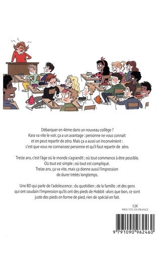 Débarquer en 4e dans un nouveau collège ? Kara va vite le voir, ça a un avantage : personne ne vous connaît et on peut repartir de zéro. Mais ça a aussi un inconvénient : c'est que vous ne connaissez personne et qu'il faut repartir de zéro. Treize ans, c'est l'âge où le monde s'agrandit ; où tout commence à être possible. Où tout est simple ; où tout est compliqué. Treize ans, ça va vite, mais ça donne aussi l'impression de durer trèèès longtemps. Une BD qui parle de l'adolescence ; du quotidien ; de la famille ; et des gens qui ont soudain l'impression qu'ils ont des pieds de Hobbit - alors que bon, ce sont juste des pieds en forme de pied, rien de spécial en fait.