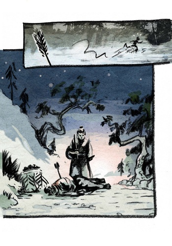 Jiro, un charbonnier, tombe par hasard sur un cadavre transpercé d'une flèche, gisant à la croisée de chemins. Des chemins qui ne sont plus très sûrs dans cette campagne japonaise du 17e siècle, depuis que sévit la horde du terrible Kuemon. Témoin de cette découverte macabre, Kaze, rônin de passage, assiste aux investigations du magistrat Nagato, au service du Seigneur Manase. A son grand amusement, l'enquête n'a de judiciaire que le nom et choisit rapidement le pauvre charbonnier comme coupable. Homme d'honneur, Kaze décide de mettre sa propre quête entre parenthèses (il recherche la fillette de ses défunts maîtres) et de rester pour prouver l'innocence de Jiro. Contre toute attente, il se lie d'amitié avec le Seigneur Manase, un virtuose de l'art théâtral du Nô…