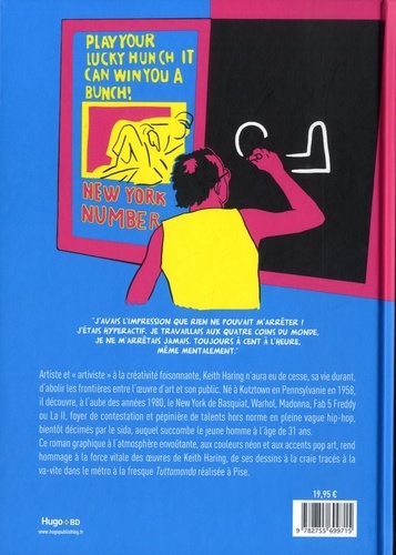 Artiste et "artiviste" à la créativité foisonnante. Keith Haring n'aura eu de cesse, sa vie durant, d'abolir les frontières entre l'oeuvre d'art et son public. Né à Kutztown en Pennsylvanie en 1958, il découvre, à l'aube des années 1980, le New York de Basquiat, Warhol, Madonna. Fab 5 Freddy ou La II, foyer de contestation et pépinière de talents hors norme en pleine vague hip-hop. bientôt décimés parle sida. auquel succombe le jeune homme à fige de 31 ans. Ce roman graphique à l'atmosphère envoûtante, aux couleurs néon et aux accents pop art, rend hommage à la force vitale des oeuvres de Keith Haring. de ses dessins à la craie tracés à va-vite dans le métro à la fresque Tuttomondo réalisée à Pise.