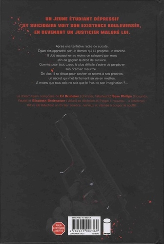 La super équipe formée par Ed Brubaker et Sean Phillips frappe à nouveau ! Kill or Be Killed est un thriller sombre, nerveux et intense qui nous conduit sur les pas d'un jeune homme forcé d'assassiner des criminels et des sales types... afin de survivre ! Après une tentative de suicide ratée, Dylan est sauvé par un démon, qui lui propose un marché. Il doit assassiner au moins un salopard par mois afin de gagner le droit de survivre. Et bien entendu, comme tout tueur, il va devoir pratiquer son premier assassinat, ce qui s'avère plus difficile que prévu... De plus, il se débat pour cacher ce secret qui met lentement sa vie en miette, ainsi que celle de ses proches.
