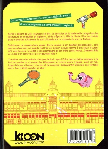 Découvrez la maternelle la plus sécurisée du monde et ses enseignants au tempérament... explosif ! Après le départ de Léo, le jumeau de Rita, la directrice de la maternelle charge tous les instituteurs de redoubler de vigilance... et de préparer la fête de l'école ! Une fois arrivés dans le quartier d'Asakusa, ils sont attaqués par un assassin du nom de Natsuki... Séduite par ce nouveau beau gosse, Rita le soumet à son habituel questionnaire... sauf que son adversaire n'a pas du tout l'air de trouver la jeune femme à son gout ! D'autant qu'il n'est pas seul : en effet, il est accompagné de son frère cadet, Haruo... Comment Rita va-t-elle s'en sortir face à ce redoutable duo ? Travailler avec des enfants n'est pas de tout repos ! Entre deux activités toboggan, il ne faut pas oublier de s'occuper des kidnappeurs et autres tueurs à gages... Avec son mélange détonant d'humour, d'action et de romance, Kindergarten Wars est une véritable récré, les cocktails molotov en plus !