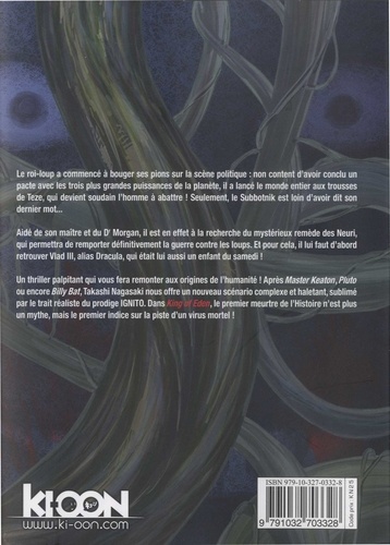 Le roi-loup a commencé à bouger ses pions sur la scène politique : non content d'avoir conclu un pacte avec les trois plus grandes puissances de la planète, il a lancé le monde entier aux trousses de Teze, qui devient soudain l'homme à abattre ! Seulement, le Subbotnik est loin d'avoir dit son dernier mot... Aidé de son maître et du Dr Morgan, il est en effet à la recherche du mystérieux remède des Neuri, qui permettra de remporter définitivement la guerre contre les loups. Et pour cela, il lui faut d'abord retrouver Vlad Ill, alias Dracula, qui était lui aussi un enfant du samedi ! Un thriller palpitant qui vous fera remonter aux origines de l'humanité ! Après Master Keaton, Pluto ou encore Billy Bat, Takashi Nagasaki nous offre un nouveau scénario complexe et haletant, sublimé par le trait réaliste du prodige IGNITO. Dans King of Eden, le premier meurtre de l'Histoire n'est plus un mythe, mais le premier indice sur la piste d'un virus mortel !