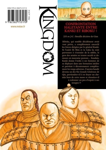 Riboku, qui semble décidément avoir tout prévu, a complètement encerclé les forces dirigées par le général Kanki. Si l'unité Hi Shin et la Gaku ka sont parvenues à s'extraire de la mêlée, le gros des armées se trouve acculé et demeure en mauvaise posture... Soudain, Kanki donne l'ordre à ses hommes de se déployer dans une formation inédite et parvient à décontenancer complètement les rangs adverses. L'ancien bandit devenu un des Six Grands Généraux de Qin, parviendra-t-il à se frayer un chemin hors de cette masse et réussira-t-il à redonner un peu d'espoir à ses troupes ? !