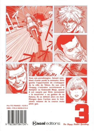 Sous son pseudonyme, faisant semblant d'avoir perdu la mémoire, Kirin guette l'opportunité de s'échapper de la ville de Tôhen. De son côté Chappy s'entraine secrètement à dompter sa Kawasaki Ninja, quand il est surpris par Kirin surnommé "le meurtrier" au guidon de sa Katana. Ils se défient alors en duel. Plongez dans l'action avec le troisième volume de la course moto plein gaz.
