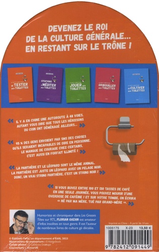 Des blagues, des anecdotes et des jeux pour ne jamais s'ennuyer au petit coin ! Une nouvelle édition des meilleures lectures sur le trône ! 5 petits livres plein d'humour et de culture générale pour ne jamais s'ennuyer, même au petit coin. Il y en aura pour tous les goûts : Histoire, sciences naturelles, médecine, nouvelles technologies, people... Et toujours avec une blague pour sourire ! Se cultiver sans se prendre la tête, testé et approuvé par les auditeurs et les téléspectateurs de Florian Gazan ! - Le petit livre pour se cultiver aux toilettes : Le retour 96 nouvelles infos futiles et utiles pour se cultiver sur le trône ! - Le petit livre pour se tester aux toilettes 96 vrais/faux amusants Vrai ou faux ? Un escargot se déplace à la vitesse de 360 m/h. Vrai. Du coup, pour un escargot, une tortue, c'est Usain Bolt. - Le petit livre des citations à méditer aux toilettes 96 " Qui a dit " et leur chute ! Qui a dit : " L'Empire, c'est la paix" ? Napoléon III ou Dark Vador ? (Napoléon III) - Le petit livre pour jouer aux toilettes 96 sudoku, quiz, mots fléchés... - Le petit livre pour gribouiller aux toilettes De quoi passer le temps en laissant ses pensées s'échapper... sur le papier !