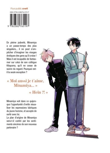 En pleine puberté, Minamiya a un passe-temps des plus singuliers... il ne peut s'empêcher de fantasmer les visages érotiques des gens qu'il croise ! Mais il est incapable d'imaginer celui de son collègue Kitayama, qu'il ne cesse de suivre du regard. Pourquoi est-il la seule exception ? "Moi aussi, je t'aime, Minamiya..." "Hein ? ! " Minamiya voit dans ce quiproquo l'opportunité d'enfin visualiser les expressions lubriques du jeune homme et accepte de sortir avec lui. Le plan d'origine de Minamiya sera-t-il contré par les sentiments sincères de son nouveau partenaire ?