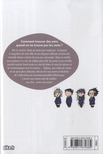 Comment trouver des amis quand on ne trouve pas les mots ? Dès la rentrée, Komi ne passe pas inaperçue : la beauté si singulière de cette fille et son élégance délicate en font une véritable déesse vénérée de tous ses camarades. Mais en réalité, son mutisme n'a rien de raffiné pour elle. En proie à une terrible anxiété sociale, Komi tente en vain de briser le mur du silence et de communiquer avec les autres... Tadano, son voisin de classe on ne peut plus ordinaire, découvrira son secret et décidera de l'aider dans ses incommensurables efforts pour s'ouvrir aux autres afin de réaliser son rêve : avoir cent amis !