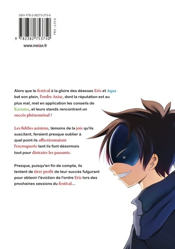 Alors que le festival à la gloire des déesses Eris et Aqua bat son plein, l'ordre Axise, dont la réputation est au plus mal, met en application les conseils de Kazuma, et leurs stands rencontrent un succès phénoménal ! Les fidèles axisiens, témoins de la joie qu'ils suscitent, feraient presque oublier à quel point ils affectionnaient l'escroquerie tant ils font désormais tout pour distraire les passants. Presque, puisqu'en fin de compte, ils tentent de tirer profit de leur succès fulgurant pour obtenir l'éviction de l'ordre Eris lors des prochaines sessions du festival...