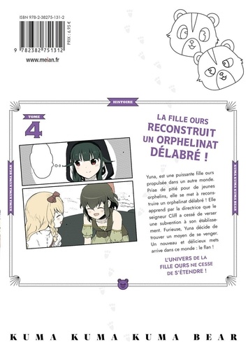 La fille ours reconstruit un orphelinat délabré ! Yuna, est une puissante fille ours propulsée dans un autre monde. Prise de pitié pour de jeunes orphelins, elle se met à reconstruire un orphelinat délabré ! Elle apprend par la directrice que le seigneur Cliff a cessé de verser une subvention à son établissement. Furieuse, Yuna décide de trouver un moyen de se venger. Un nouveau et délicieux mets arrive dans ce monde : le flan ! L'univers de la fille ours ne cesse de s'étendre !