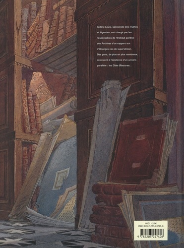 A l'Institut Central des Archives, Isidore Louis s'attelle à une mission inédite : élaborer un rapport sur les mystérieuses " Cités obscures ". S'agit-il d'une fiction, d'une superstition, d'un culte ? Document après document, l'archiviste enquête et analyse. Mais contre toute attente, il se laisse bientôt attirer par son singulier objet d'étude... Cet récit illustré digne de Jorge Luis Borges reparaît à l'occasion des 40 ans des Cités obscures. L'Archiviste reste un volume pivot pour entrer dans l'univers des Cités... ou pour voyager en miroir de celui-ci. Schuiten et Peeters s'y amusent du monde qu'ils ont créé en 1982, et pour accompagner le premier tirage de cette édition anniversaire, ils proposent une carte des Cités dans une version inédite.