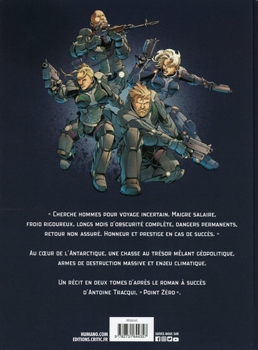 "Cherche hommes pour voyage incertain. Maigre salaire, froid rigoureux, longs mois d'obscurite complete, dangers permanents, retour non assure. Honneur et prestige en cas de succès." Au coeur de l'antarctique, une chasse au trésor mêlant géopolitique, armes de destruction massive et enjeu climatique. un récit en deux tomes d'après le roman à succès d'Antoine Tracqui, "Point zéro".