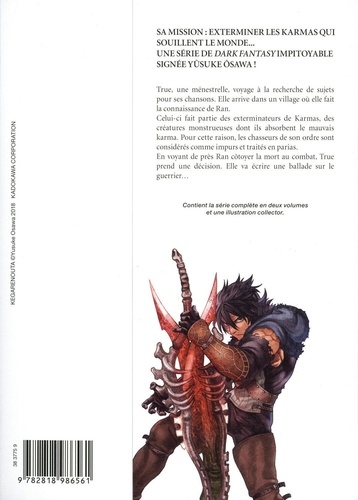 Sa mission : exterminer les Karmas qui souillent le monde... Une série de dark fantasy impitoyable signée Yûsuke Osawa ! True, une ménestrelle, voyage à la recherche de sujets pour ses chansons. Elle arrive dans un village où elle fait la connaissance de Ran. Celui-ci fait partie des exterminateurs de Karmas, des créatures monstrueuses dont ils absorbent le mauvais karma. Pour cette raison, les chasseurs de son ordre sont considérés comme impurs et traités en parias. En voyant de près Ran côtoyer la mort au combat, True prend une décision. Elle va écrire une ballade sur le guerrier... Contient la série complète en deux volumes et une illustration collector.