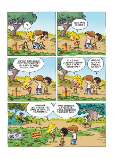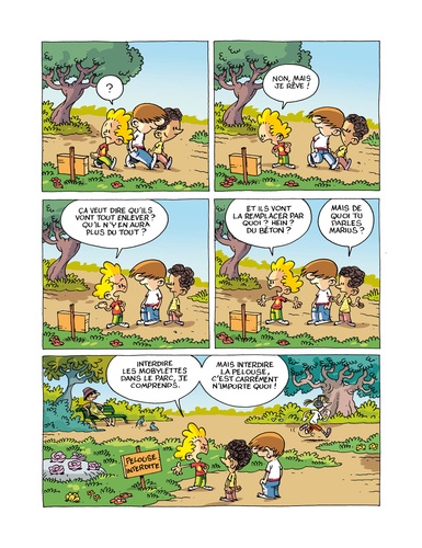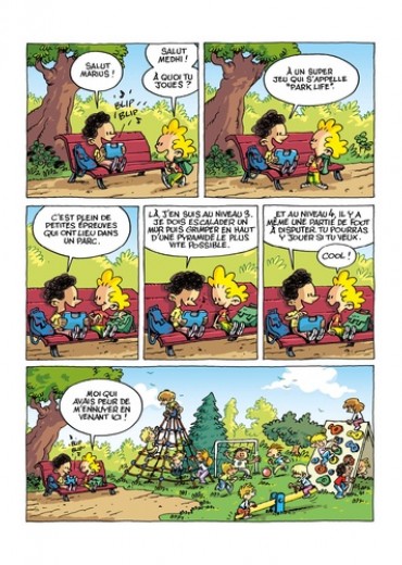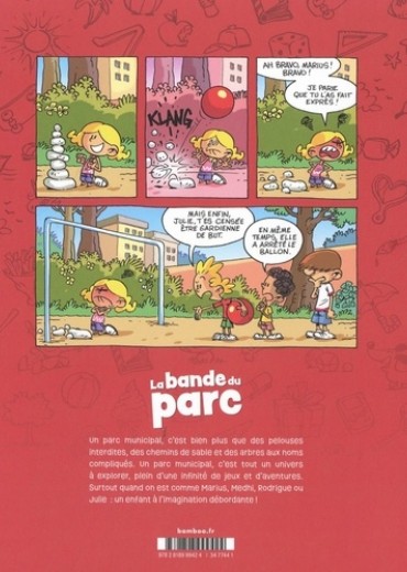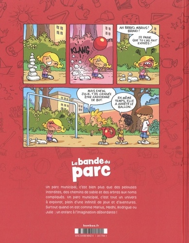 Jouer au parc avec ses potes, c'est toute une aventure ! Marius, Medhi, Rodrigue et Julie passent leur temps au parc municipal. Ils ne s'ennuient jamais. Ou alors pas longtemps, car le parc leur offre tout ce qu'un enfant peut espérer : de l'action, du mystère, de l'aventure et des possibilités de jeux infinies. Cela ne les empêche pas d'avoir un oeil sur ce qui les entoure et, une chose est sûre, s'ils voient le monde avec leurs yeux d'enfants, leur analyse est bien plus pertinente que celles de beaucoup d'adultes.