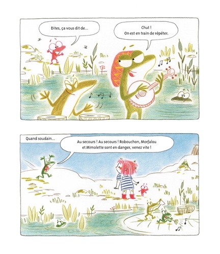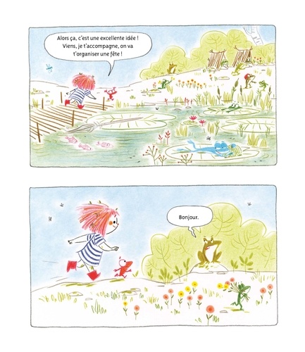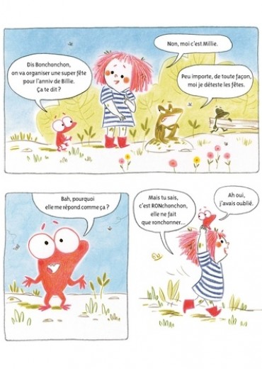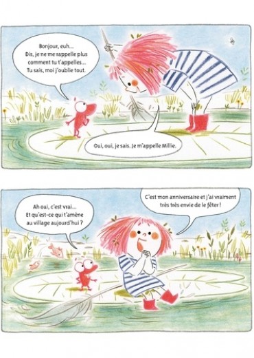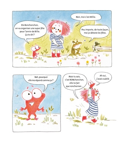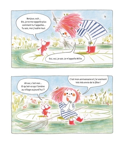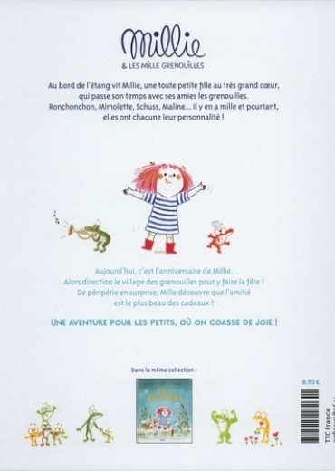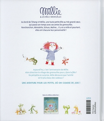 Millie et les mille grenouilles : une nouvelle série de BD pour les 3-5 ans ! Au bord de l'étang vit Millie, une toute petite fille au très grand coeur, qui passe son temps avec ses amies les grenouilles. Ronchonchon, Mimolette, Schuss, Maline... il y en a mille, et pourtant elles ont chacune leur don et leur personnalité ! Aujourd'hui, c'est l'anniversaire de Millie. Alors direction le village des grenouilles pour y faire la fête ! Mais ici tout le monde semble bien trop occupé pour y penser... Dory a même oublié son prénom ! Voilà Millie bien déçue... De péripétie en surprise, Mille apprendra qu'elle peut toujours compter sur ses amies !