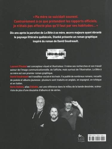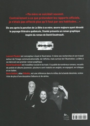 "Ma mère se suicidait souvent. Contrairement à ce que prétendent les rapports officiels, je n'étais pas affecté plus qu'il faut par ses habitudes.." Dix ans après la parution de La Bête à sa mère, oeuvre majeure ayant ébranlé le paysage littéraire québécois, Stanké présente un roman graphique inspiré du roman de David Goudreault.