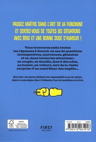 Passez maître dans l'art de la punchline et sortez-vous de toutes les situations avec brio et une bonne dose d'humour ! Votre famille vous harcèle en vous demandant pourquoi vous n'êtes pas marié, que leur répondre ? Je ne veux pas faire la même bêtise que vous et me marier avec le (la) premier(e) venu. Je suis zoophile et le mariage avec une chèvre n'est pas encore autorisé. Ma maîtresse est déjà marié avec un membre de la famille. Pourtant je cherche une femme bien ! Tous les week-end en club échangiste. Mon travail de chômeur me prend trop de temps. Votre femme vous surprend avec une femme dans votre lit, que lui répondre ? Je te présente Natasha, elle est testeuse de literie professionnel. Je te jure que je ne dors pas avec elle. Ce n'est pas ce que tu crois ! A moins que tu ne penses que c'est ma maitresse. Je ne te trompe pas, je prends des cours de sexe pour être un meilleur amant. Pour ton anniversaire, je t'offre un plan à 3 !