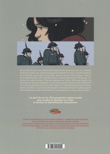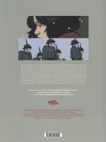 Edita Adlerova est une adolescente passionnée de lecture qui vit à Prague dans les années 1930. Quand les nazis envahissent la ville, tous les membres de sa famille, parce qu'ils sont juifs, doivent porter l'étoile jaune. Puis ils sont déportés pour être internés dans le camp d'Auschwitz-Birkenau. Au milieu de cette horreur, Dita est parquée au Block BIIb dans lequel les familles ne sont pas séparées, et où chacun peut conserver ses vêtements sur le dos et ses cheveux sur la tête. Quand le charismatique Fredy Hirsch, leader du Block, lui propose de récupérer les huit précieux volumes que les prisonniers ont réussi à dissimuler aux gardiens du camp, elle accepte... Au péril de sa vie, Dita prend des risques inouïs pour cacher et protéger ce trésor et devenir la bibliothécaire d'Auschwitz.